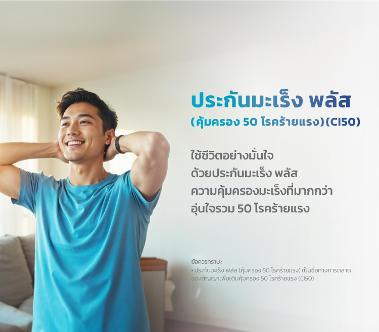 - ประกันมะเร็ง พลัส (คุ้มครอง 50 โรคร้ายแรง) เป็นชื่อทางการตลาดของ สัญญาเพิ่มเติมคุ้มครอง 50 โรคร้ายแรง (CI50)