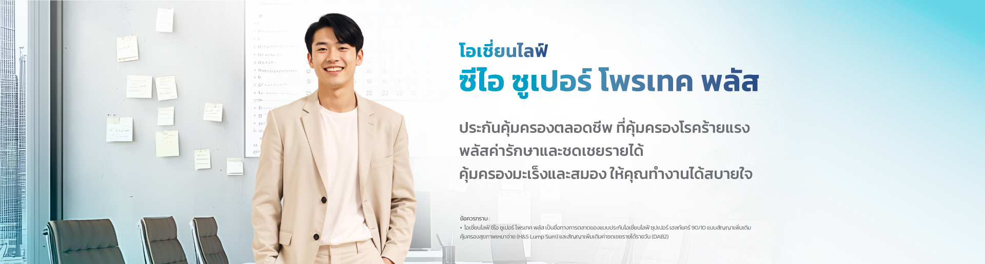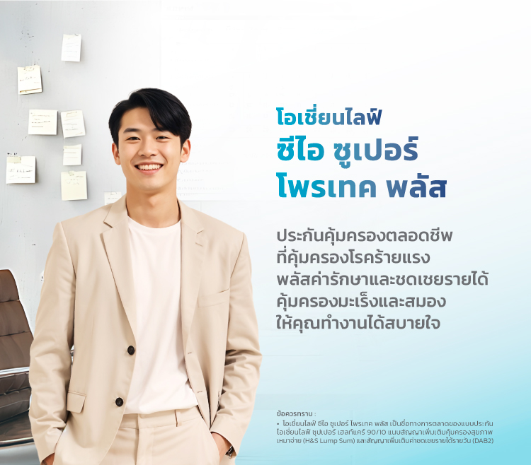 - ซีไอ ซูเปอร์ โพรเทค พลัส เป็นชื่อทางการตลาดของแบบประกันโอเชี่ยนไลฟ์ ซุปเปอร์ เฮลท์แคร์ 90/10 แนบสัญญาเพิ่มเติมคุ้มครองสุขภาพเหมาจ่าย (H&S Lump Sum) และสัญญาเพิ่มเติมค่าชดเชยรายได้รายวัน (DAB2)