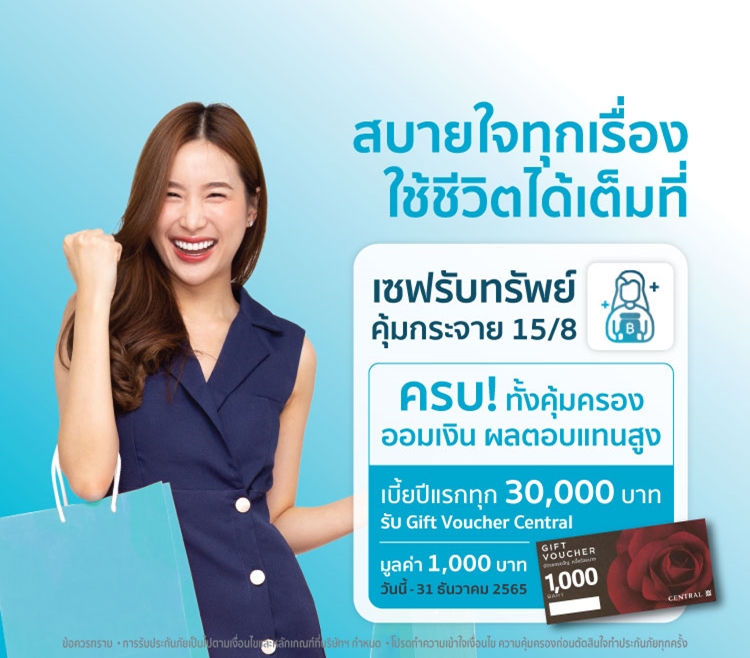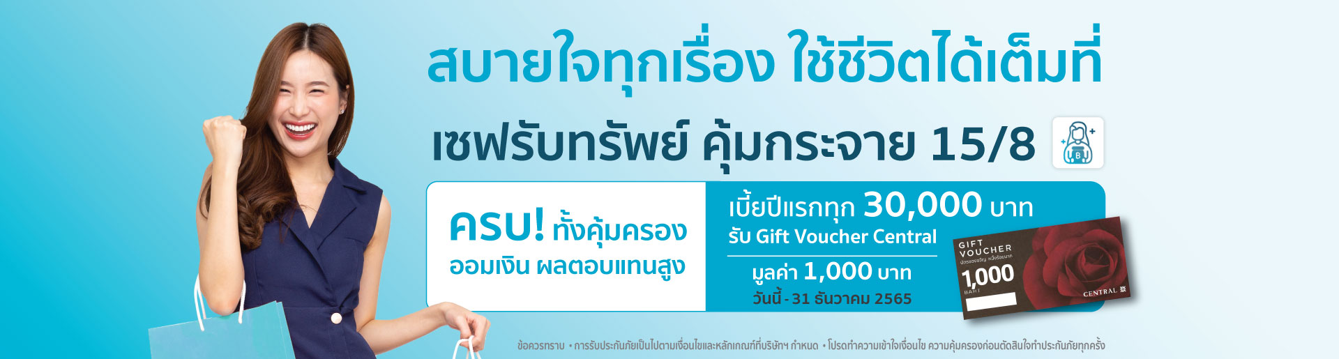 สำหรับลูกค้าที่ขอทำประกันภัย แบบประกันเซฟรับทรัพย์ คุ้มกระจาย 15/8 ผ่านช่องทาง Digital Sale ในวันที่ 25 ตุลาคม 2565 - 31 ธันวาคม 2565 เบี้ยประกันปีแรกทุก 30,000 บาท รับ Gift Voucher Central มูลค่า 1,000 บาท