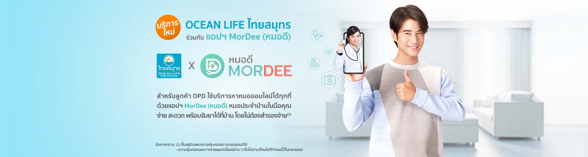 1. สำหรับลูกค้า OCEAN LIFE ไทยสมุทร ที่มีกรมธรรม์ของบริษัทฯ และกรมธรรม์ดังกล่าวมีความคุ้มครองค่ารักษาพยาบาลผู้ป่วยนอก (OPD) และในวันที่ใช้บริการแอปพลิเคชัน หมอดี (MorDee) กรมธรรม์และความคุ้มครองค่ารักษาพยาบาลผู้ป่วยนอก (OPD) ดังกล่าวต้องมีผลบังคับ (ประกันรายเดี่ยว : สำหรับผู้เอาประกันภัยที่มีบันทึกสลักค่ารักษาพยาบาลแบบผู้ป่วยนอก (OPD) (Plan Code 43) หรือสัญญาเพิ่มเติมคุ้มครองสุขภาพ ซูพรีม เฮลท์ (Plan Code 71) แผน 3 / แผน 4 เท่านั้น และต้องมีผลบังคับไม่น้อยกว่า 120 วัน, ประกันกลุ่ม : แผนประกันกลุ่มที่มีความคุ้มครองค่ารักษาพยาบาลผู้ป่วยนอก (OPD) ทั้งนี้เงื่อนไขและสิทธิ์การใช้บริการขึ้นอยู่กับฝ่ายการตลาดประกันกลุ่ม)